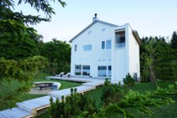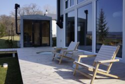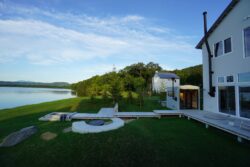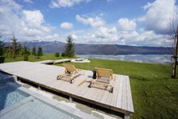 圧倒的な自然との対話を楽しめる一棟貸しホテルSANSUIの屋外テラスに道南杉のウッドデッキを採用しました。