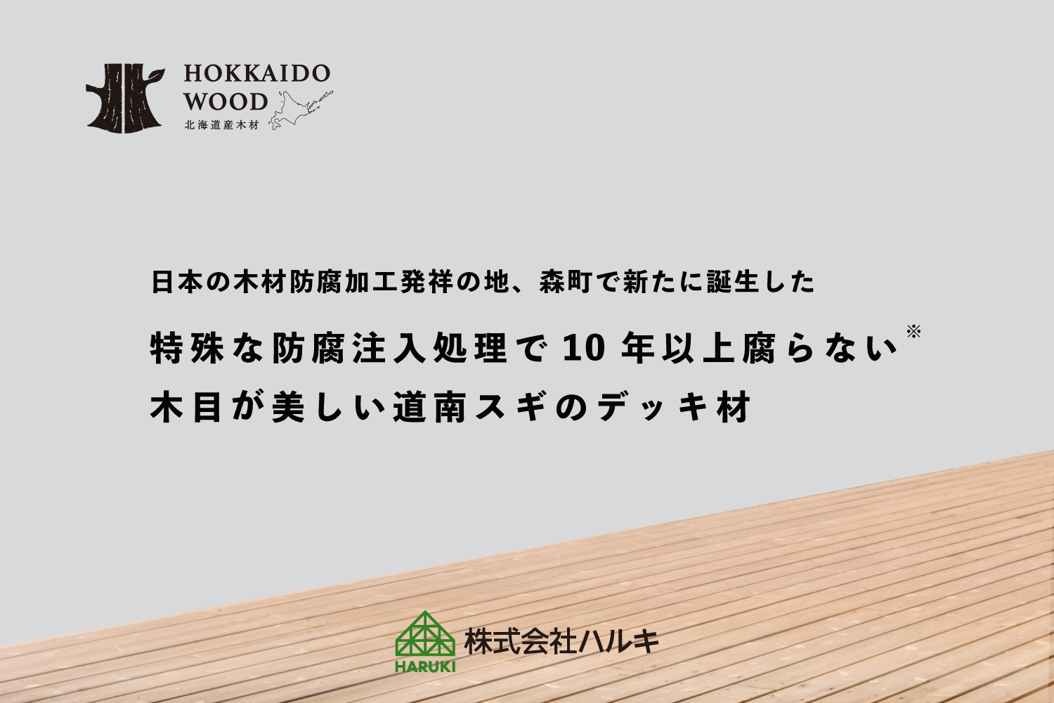 特殊な防腐注入処理で、10年以上腐らない、木目が美しい 道南杉のデッキ材